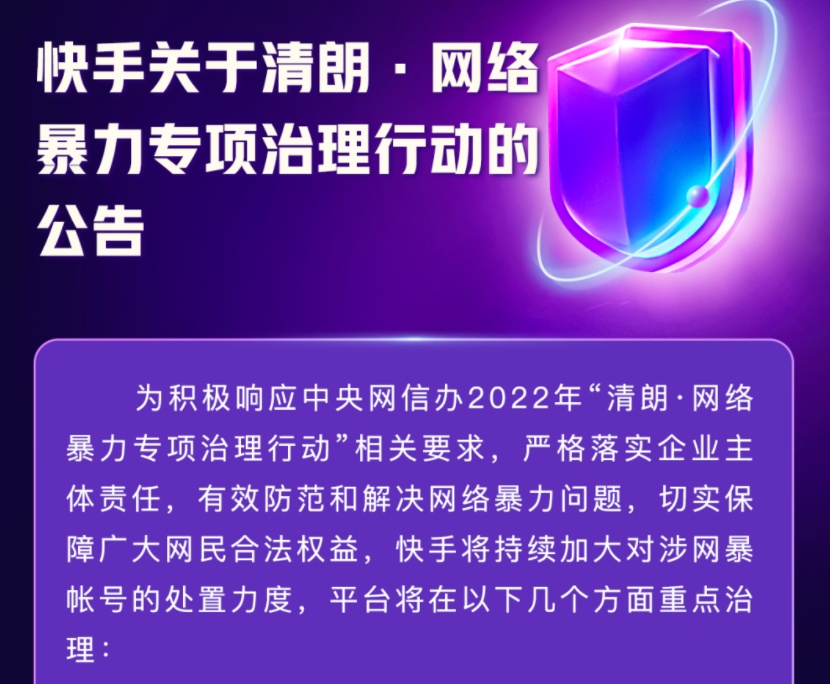快手將持續(xù)加大對涉網暴帳號處置力度