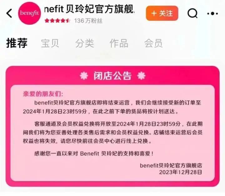 代變了,海外彩妝品牌已經(jīng)不吃香了。近日,美國彩妝品牌貝玲妃benefit在天貓、京東、抖音三大線上平臺發(fā)布公告,宣布其官方店鋪將于2024年1月28日23時59分起停止運營,不再接受新訂單。同時,客服服務和會員權益兌換也將同步關閉,所有會員權益將失效。圖源:淘寶App截圖…